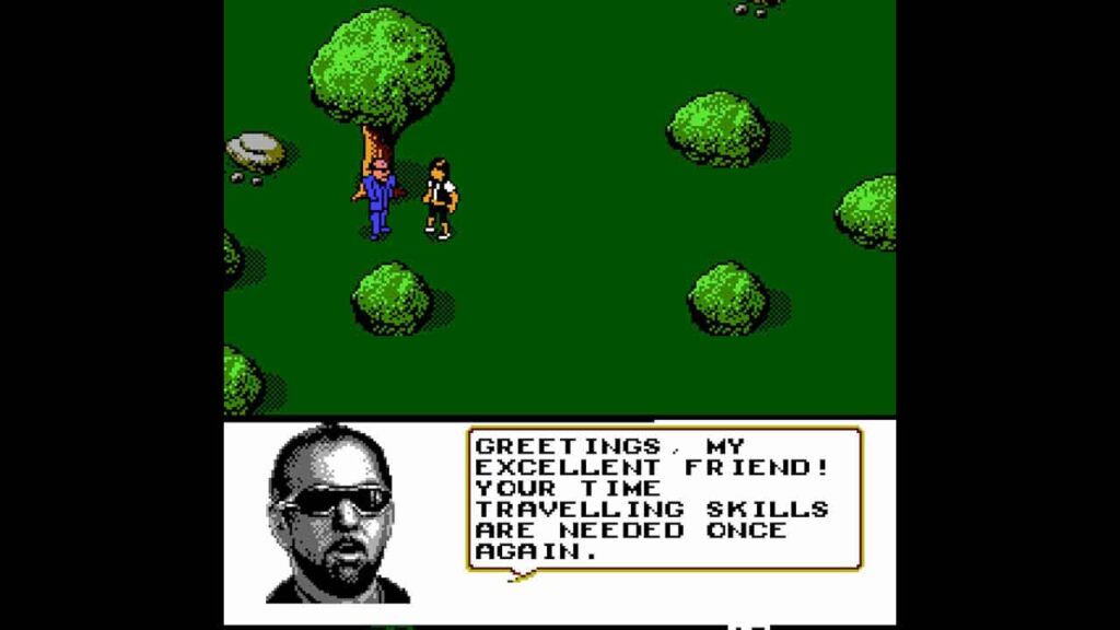 Dikeluarkan untuk NES, permainan video Bill and Ted’s Excellent Adventure ialah permainan aksi isometrik di mana anda mengembara melalui tempoh masa yang berbeza untuk mencari orang terkenal dari sejarah, yang nampaknya adalah rekaan. Orang-orang ini telah diletakkan dalam tempoh masa yang salah dan menjadi tugas anda untuk mencari item yang berkaitan untuk mengeluarkan mereka dari persembunyian dan membawa mereka kembali ke masa di mana mereka berada.