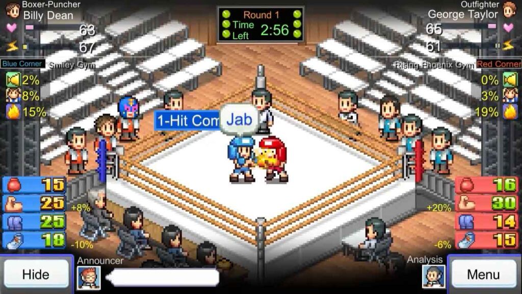 Sekarang setelah anda melatih peninju anda, tiba masanya untuk menghantarnya ke gelanggang. Permainan ini menggambarkan aksi dalam gelanggang dengan sangat terperinci. Anda boleh menonton liputan langsung peninju di gelanggang, dengan gerakan seperti cangkuk kiri dan jelingan yang menarik. Selepas setiap pusingan, anda juga boleh memberi nasihat di luar pentas, termasuk strategi menyerang dan bertahan. Pada pendapat saya, bahagian yang paling menarik dalam Kisah Gim Tinju ialah perlawanan, menonton lawan anda dan pasukan anda di gelanggang tinju, melemparkan tumbukan lurus, mengelak ke belakang, melangkah ke tepi dan kemudian memukul dua kombo… Ia adalah pilihan yang bagus untuk bertarung.