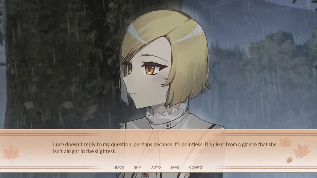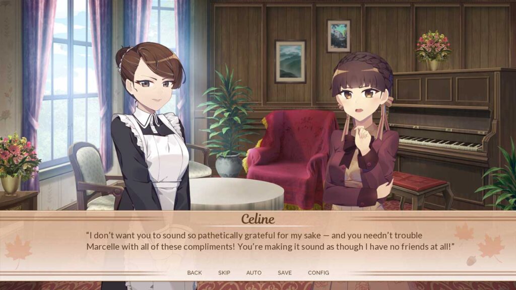 Bagi plot, kita boleh mengatakan bahawa ia kelihatan agak baik. Kadang-kadang terdapat banyak lompatan masa, kebanyakannya dalam laluan dua watak Mirabel dan Celine, tetapi saya fikir itu bagus, kerana melalui setiap hari akan membosankan. Saya melihat beberapa kesilapan menaip dan sebagainya semasa permainan, tetapi ia tidak mengganggu saya daripada menikmati cerita itu.