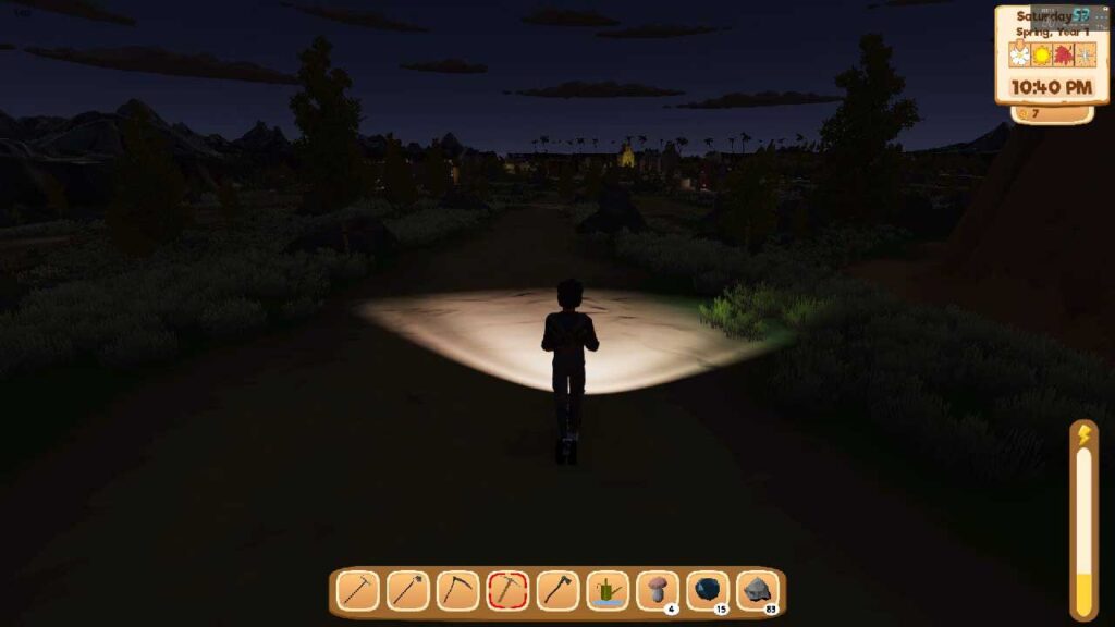 Wira mempunyai skala keletihan yang cepat habis (pada mulanya). Dengan melakukan pelbagai aksi, watak itu dipromosikan di satu kawasan atau yang lain. Anda perlu tidur di atas katil setiap malam untuk memulihkan tenaga dan permainan mempunyai kitaran siang dan malam. Kemudian, anda boleh memutuskan cara untuk membangunkan bidang impian anda dan menanam berpuluh-puluh pokok buah-buahan dan tanaman yang berbeza di ladang anda. Sistem ekonomi agak standard. Kami membeli sumber yang diperlukan dari kedai dan jika kami perlu menjualnya, kami meletakkannya di dalam peti berhampiran rumah utama.
