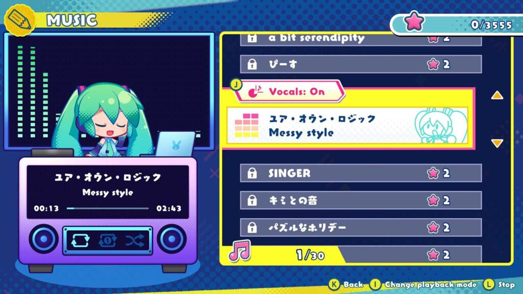 Terdapat banyak pilihan pakaian watak dan hiasan bilik untuk dipilih, yang menyeronokkan, dan satu lagi ciri menarik ialah watak bertindak balas apabila anda mengisi barisan atau membuat kesilapan. Saya juga berpendapat muzik latar belakang yang disiarkan secara terbuka dan imej yang disiarkan secara terbuka yang berfungsi sebagai teka-teki adalah unsur budaya Vocaloid yang hebat.