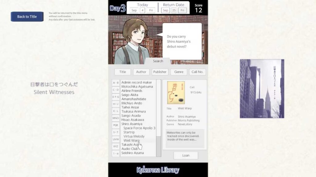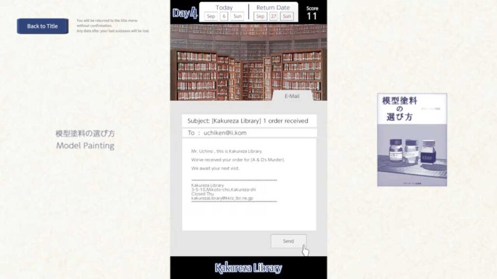 Saya rasa tarikan utama Perpustakaan Kakureza bukan dalam permainan, tetapi dalam cara anda mengenali watak-watak melalui buku yang mereka pinjam dan dialog kasual mereka. Contohnya, seseorang mungkin meminjam “buku tentang cara menulis surat” dan beberapa hari kemudian orang lain mungkin datang mencari “buku tentang cara menulis balasan surat.” Daripada satu buku, anda boleh melihat latar belakang orang itu dan hubungan mereka dengan orang lain.