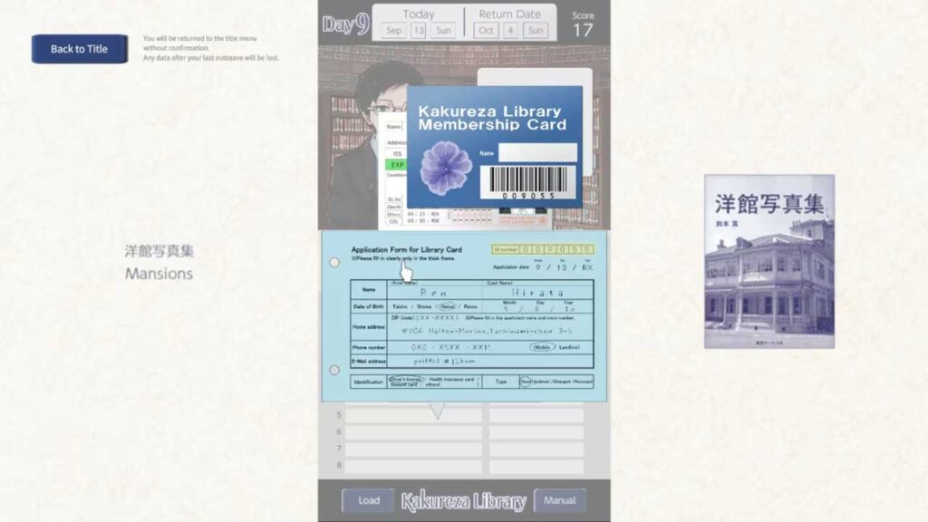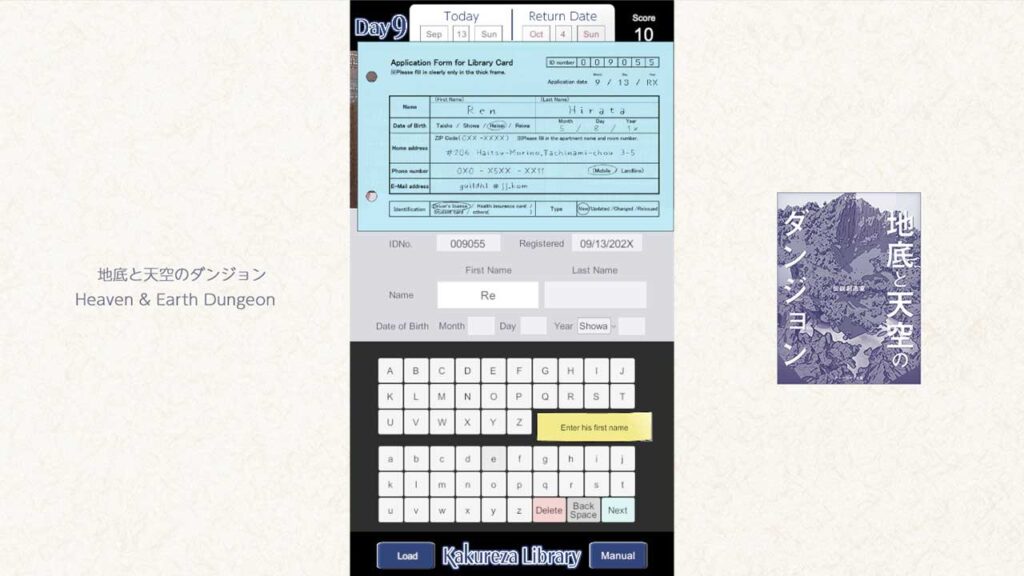 Ini bukan permainan seperti Paper Please di mana anda perlu memenuhi permintaan yang semakin sukar daripada pengguna, sebaliknya pengembaraan yang mengikuti cerita. Sebaliknya, Perpustakaan Kakureza ialah permainan di mana anda mengimbas kad keahlian pengguna yang masuk satu demi satu, menerima buku yang dipulangkan, meminjam buku baharu dan mencari buku yang sepadan dengan permintaan mereka.