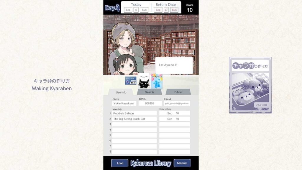 Tarikh dan masa lawatan setiap pengguna, buku yang mereka bawa, dan permintaan carian adalah tetap, dan tiada had masa, jadi jika anda bermain tanpa berfikir, dari pusingan kedua dan seterusnya, anda hanya akan mengulangi tugas membosankan yang sama setiap hari. Namun, amat menarik untuk meneka personaliti pengguna dan situasi yang mereka hadapi daripada tajuk buku yang dipinjam dan adegan pendek yang menarik perhatian.