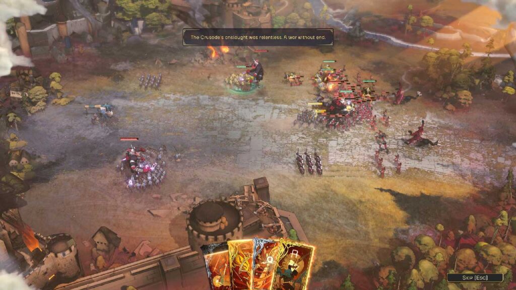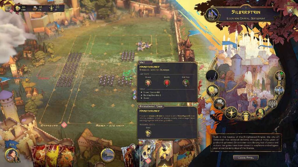 Dalam permainan, kami bergerak di sekitar peta dan menyelesaikan tugas, kadangkala berlumba dengan masa. Selepas bergerak melalui peta dengan wira kami dan askarnya, kami menawan bandar dan menyelesaikan misi sampingan dan utama. Bahagian pertempuran adalah mudah, tentera anda, yang telah anda letakkan (secara strategik jika boleh), secara automatik bergerak, menyerang dan melemparkan kemahiran menentang musuh, tetapi anda mempunyai dek di tangan untuk Campur Tangan dalam kes ini, tetapi tidak secara langsung. Dek ini diaktifkan semasa pertempuran bergantung pada cooldown, dan kadangkala anda merancang dengan sedikit pemikiran dan kadangkala dengan sumbang saran.