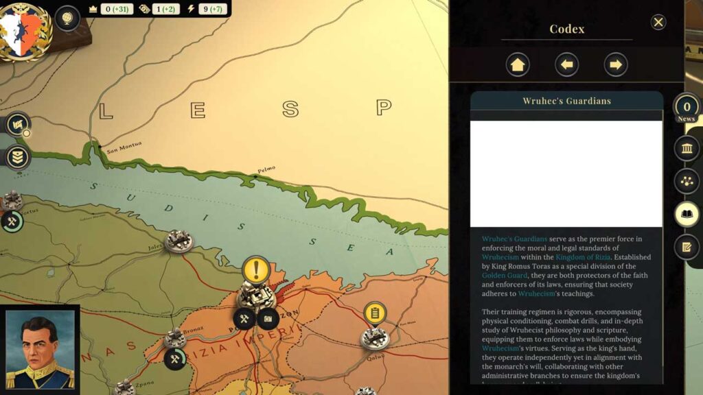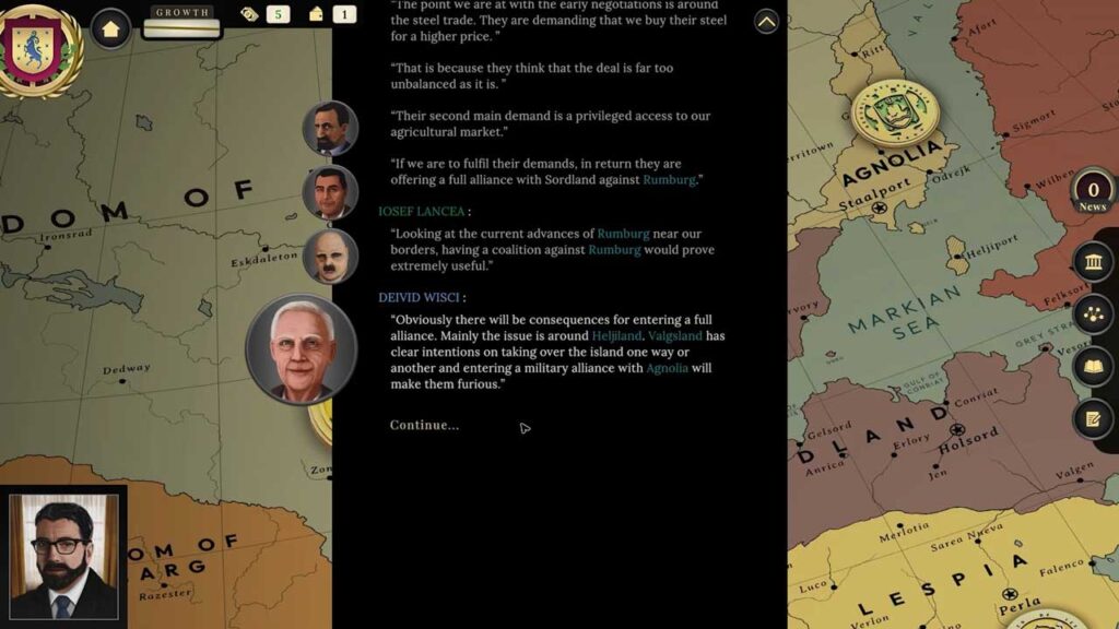 Perkara pertama yang akan anda perhatikan ialah kisah negara fiksyen yang sangat terperinci. Setiap peristiwa bersejarah, tempat bersejarah, ahli politik, bandar, parti politik begitu terperinci dan penuh dengan maklumat. Setiap ahli politik yang anda pilih, anda akan mengetahui banyak tentang mereka, latar belakang mereka, tindakan mereka, motivasi mereka sehingga anda boleh mengaitkannya dengan mereka dan memahami mengapa seseorang itu sedemikian rupa. Anda ditarik ke dalam dunia fantasi ini di mana setiap orang mempunyai cerita, setiap negara mempunyai sejarah, setiap parti politik mempunyai motivasi dan anda rasa seperti anda seorang yang sebenar dan membuat keputusan yang sebenar. Saya tidak dapat menekankan betapa baiknya perkara ini dilakukan dalam permainan ini.