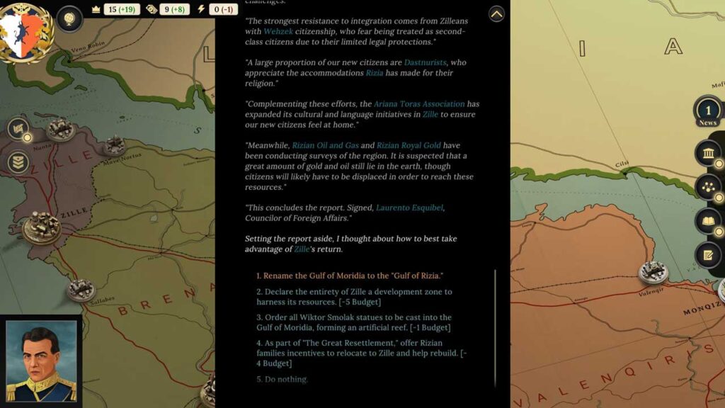 Kedua, ini bukan sekadar permainan di mana anda menguruskan slider bajet dan memilih beberapa pilihan. Ia adalah simulasi yang sangat mendalam di mana anda diberi situasi, seperti projek infrastruktur utama yang mana untuk dilaburkan, sama ada untuk menerima rasuah, sama ada untuk menjadi kapitalis atau sosialis, tradisional atau reformis, negara mana yang hendak bersekutu, dan seribu pilihan lain yang secara langsung mempengaruhi hasil jangka pendek dan jangka panjang. Saya selesai bermain permainan dan pergi untuk menyemak pencapaian dan menyedari bahawa mungkin terdapat berpuluh-puluh hasil lain. Itu menjadikannya berbaloi untuk dimainkan sekurang-kurangnya beberapa kali.