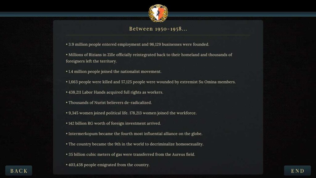 Anda bermain sebagai seorang ahli politik muda yang bercita-cita tinggi di sebuah negara dengan ekonomi yang merosot, perlembagaan yang ketinggalan zaman, dan hubungan yang buruk dengan jirannya. Anda memenangi pilihan raya 1953 dan mengambil alih kuasa dengan matlamat untuk mengeluarkan negara anda daripada kemelesetan, memperbaharui undang-undang, dan melindunginya daripada ancaman asing, semuanya sambil memastikan rakyat, kabinet dan keluarga anda gembira. Ia adalah cerita yang benar-benar mengujakan. Ia mempunyai pelbagai pengakhiran dan pengakhiran dengan halaman ringkasan terperinci yang menunjukkan kepada anda bagaimana anda telah memberi impak kepada negara dan bagaimana sejarah akan mengingati anda. Terdapat klise dan lubang plot sekali-sekala, tetapi ini tidak menjejaskan cerita yang baik.