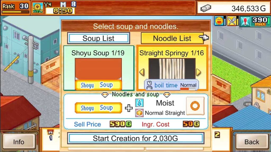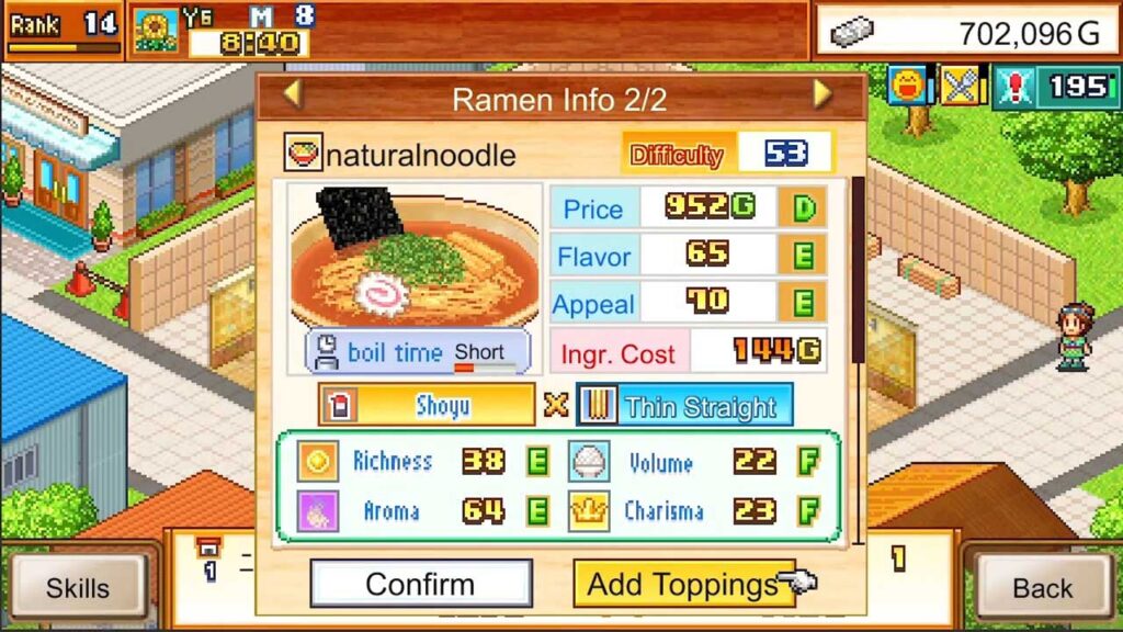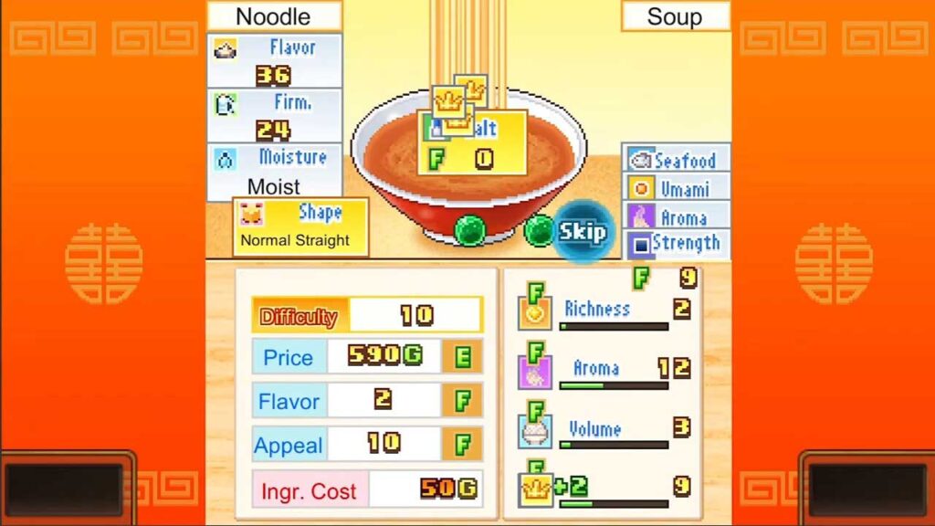 Permainan ini agak bagus untuk membunuh masa, jadi terdapat banyak rendaman pada mulanya. Tetapi memandangkan ini adalah port langsung permainan lama, terdapat beberapa penyelesaian dan isu UI. Tetapi ia masih mengalami kekurangan dan kelemahan di kawasan lain yang menyukarkan untuk mengesyorkan permainan kepada semua pemain. Walau bagaimanapun, saya sangat suka membuat ramen sendiri dan membuka kedai. Dalam permainan ini, pemain boleh menggabungkan sup dan mi yang berbeza untuk mencipta hidangan baru, pemain boleh memilih lauk untuk menjadikan ramen lebih berkhasiat.