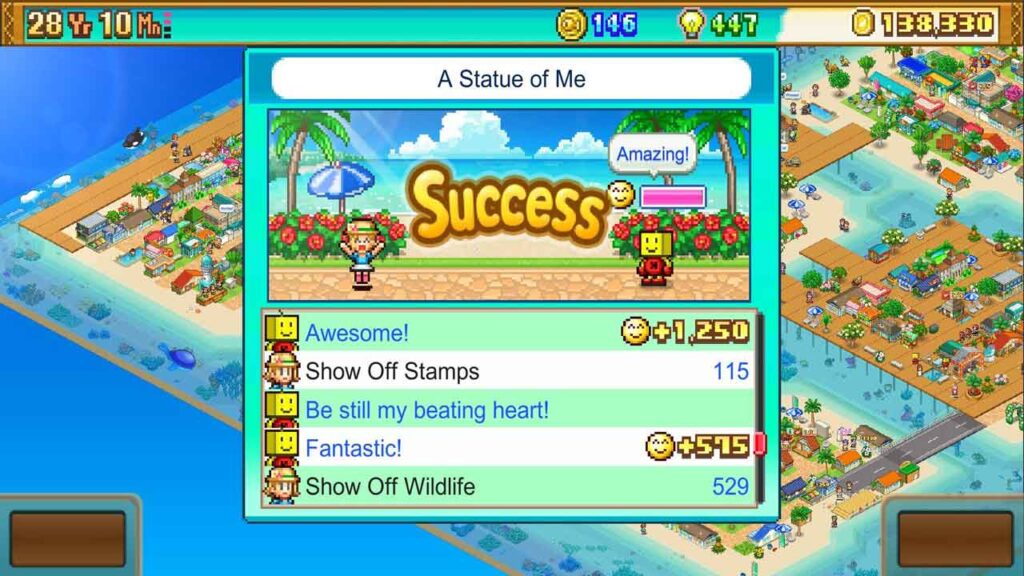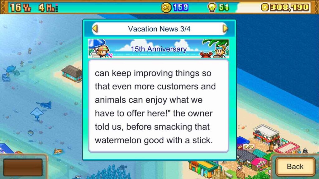 Seperti yang dinyatakan sebelum ini, ini adalah permainan Kairosoft yang sangat klasik, dan perkara yang perlu diuruskan oleh pemain ialah pembangunan, pengembangan dan keuntungan “pulau resort” yang lengkap. Dalam permainan ini, pemain menguruskan pulau peranginan mereka, membuka pelbagai kemudahan untuk memenuhi keperluan pelanggan, mengkonfigurasi aktiviti, dan mengupah pekerja untuk memperkayakan perniagaan, dan memulakan perjalanan resort mereka sendiri.